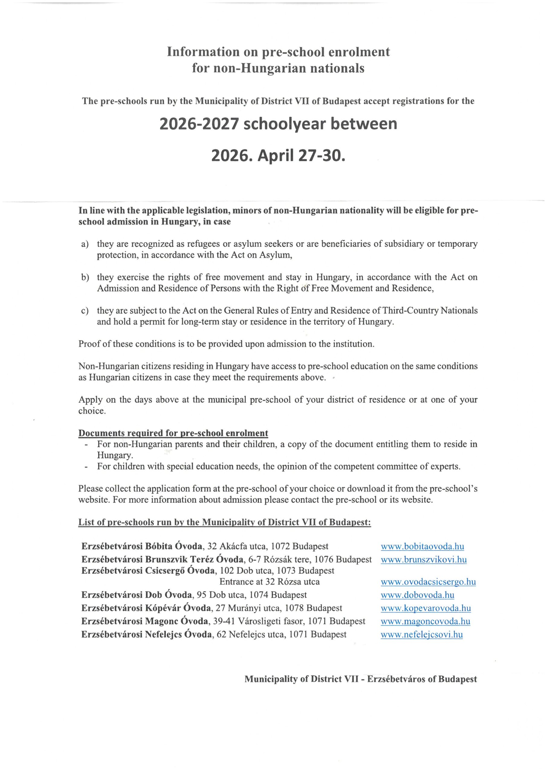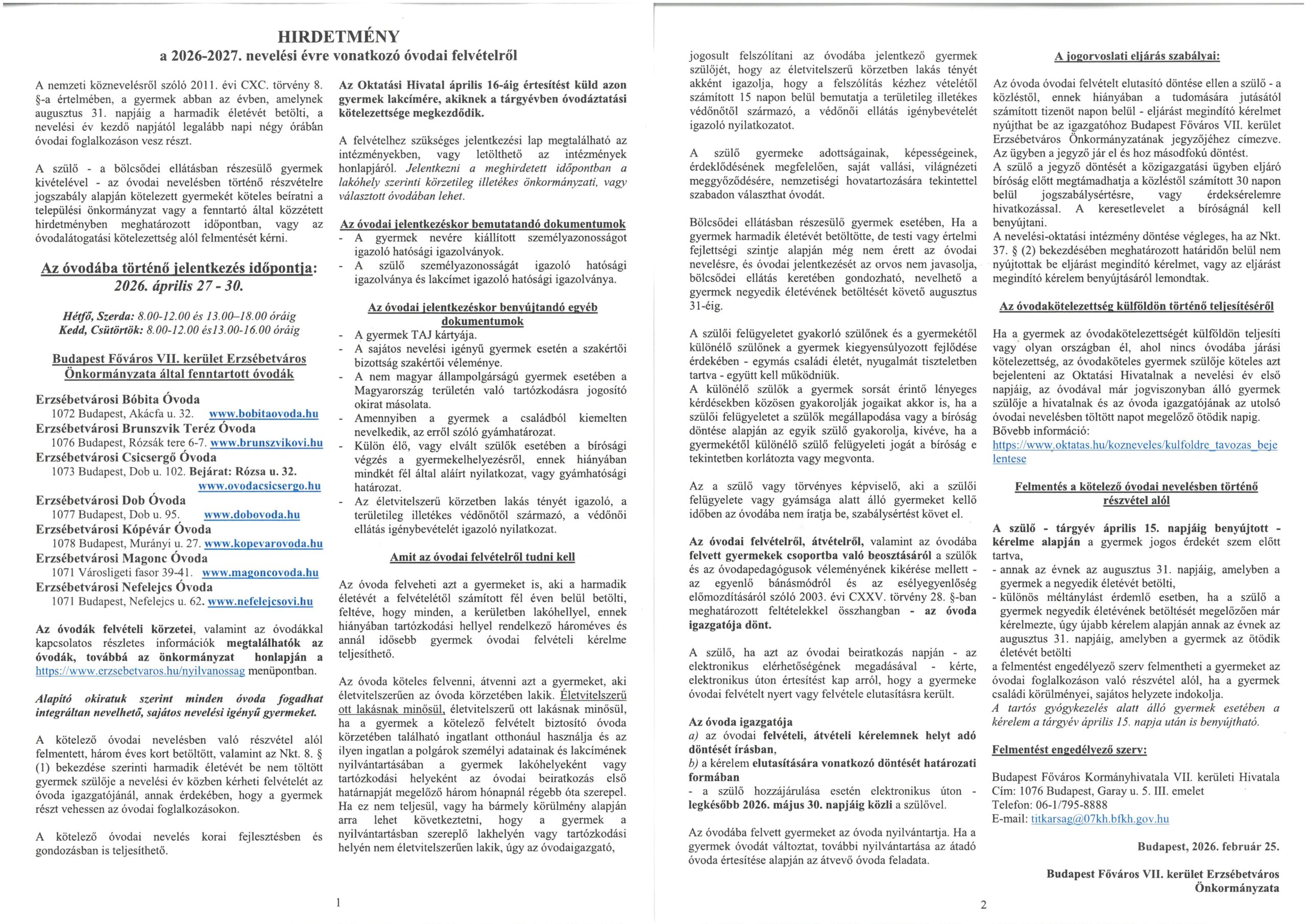 Óvodai jelentkezési tudnivalók 2026